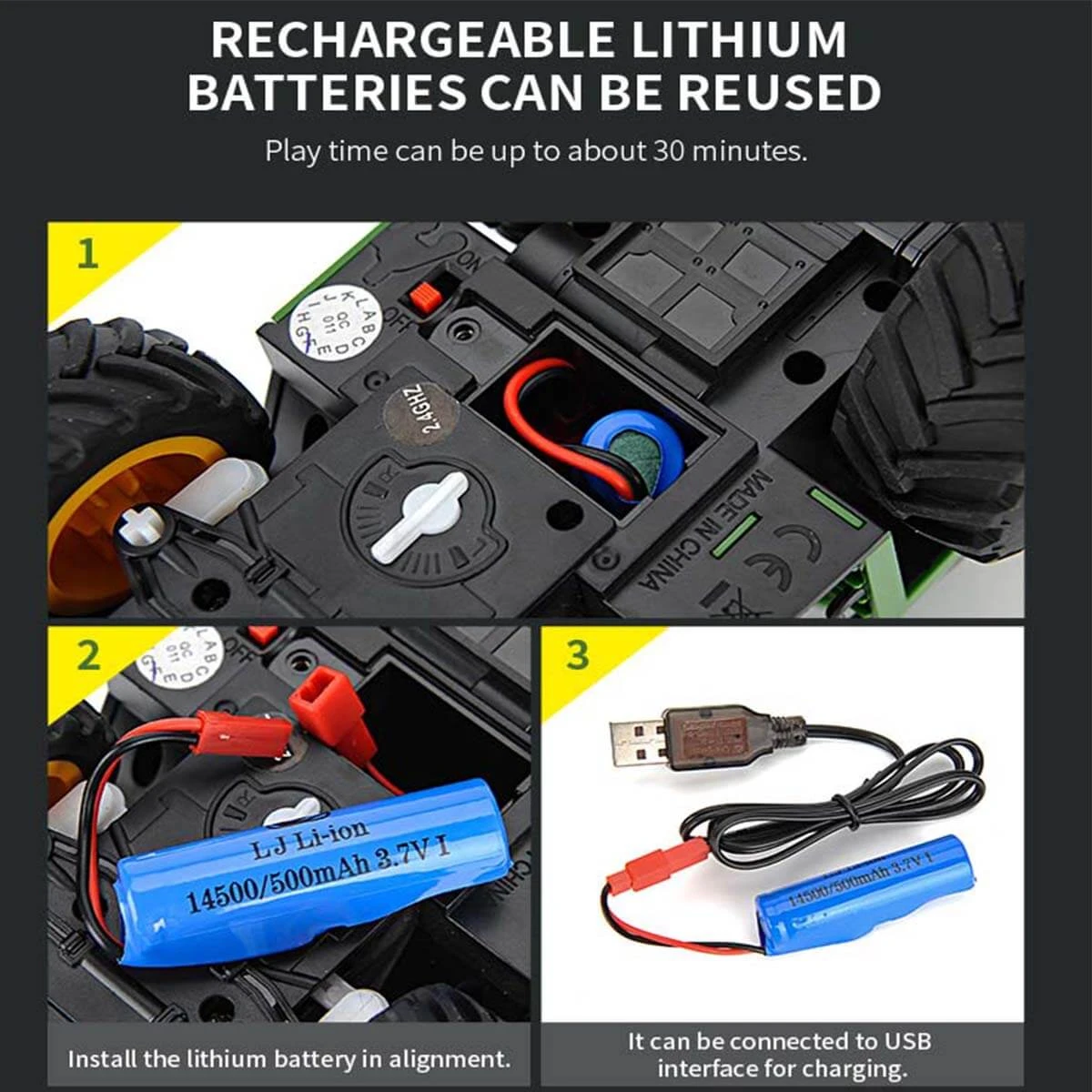 Powerful System: The four-wheel drive is full of power and can easily drive on muddy ground. Meanwhile the rechargeable battery is reusable for up to 30 minutes of play time.
