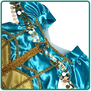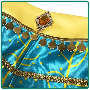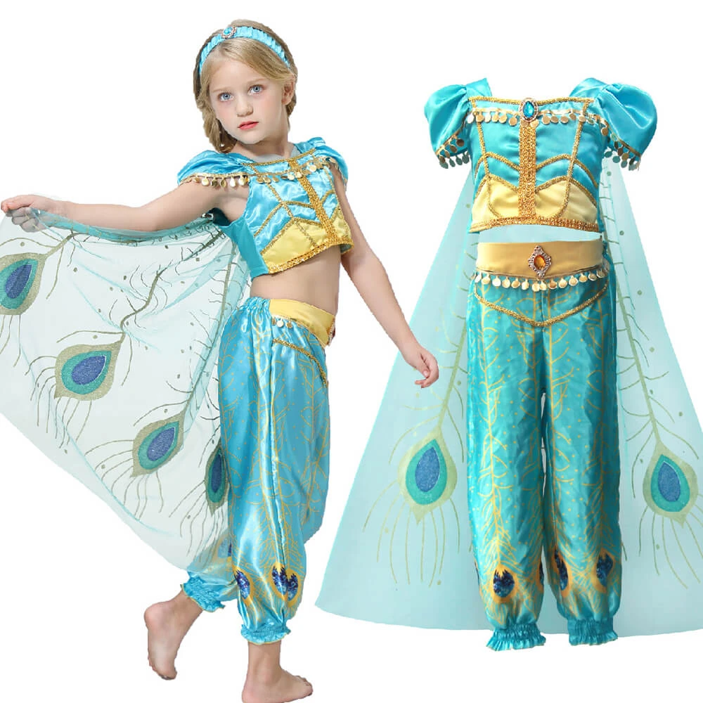 - The outfit features with gold glitter embroider design, and peacock printing, like a real Arabian princess.