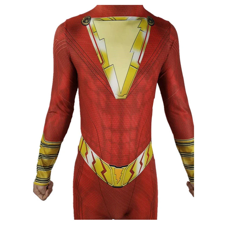 - This Shazam costume gives your child everything they need to look like their favorite DC superhero! The exterior of the suit has textured print to help give it an authentic look.