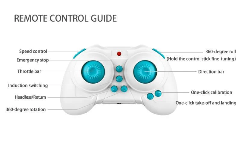 Function: Up/down, Forward/backward,Turn left/right, Sideward flight, Hovering, Headless Mode, Altitude hold mode, Infrared sensing control function, Throw to Fly