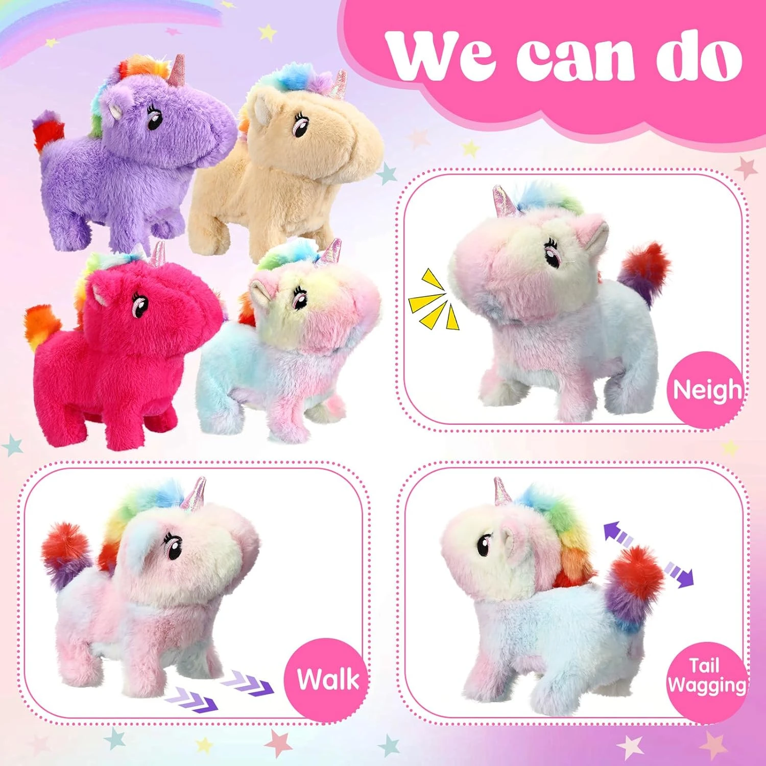 - It can imitate the behavior of a unicorn, walking, beeping sideways, nodding, shaking its tail, and greeting the toddler and inviting him to play.