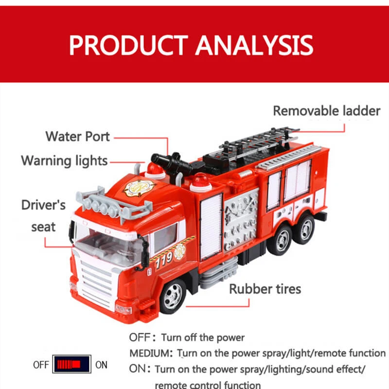 The Remote Control Fire Truck is a perfect gift for kids. It has a large capacity water tank, and the water spray distance is about 5 meters with adjustable angle.